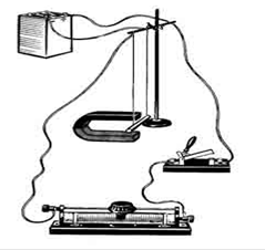 Для проводу-качелей застосований гнучкий провід у хлорвініловій ізоляції, припаяний до мідного проводу діаметром 1-2 мм. Установку збирають за рис. 2.2.3.1. Кінці гнучкого проводу через вимикач і реостат підключають до джерела живлення. При замиканні ланцюга на провідник зі струмом діє сила з боку магнітного поля дугоподібного магніта. Напрямок цієї сили можна змінювати як зміною напрямку струму, так і зміною полюсів магніту, тобто зміною напрямку магнітного поля на протилежний.