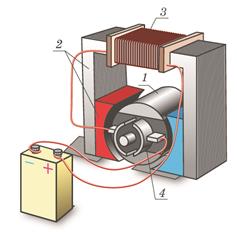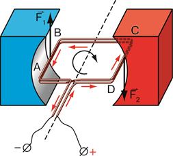 Магнітне поле, діючи на вертикальні сторони рамки, змушує її повертатися так, що її площина розташовується перпендикулярно до силових ліній поля. При цьому за інерцією рамка щоразу проходить трохи далі від положення рівноваги. Якщо в момент проходження рамкою положення рівноваги щоразу змінювати напрямок струму в ній, то вона буде безупинно обертатися.