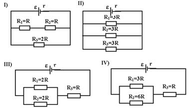 6. В якій або в яких зазначених схемах, потужність на внутрішньому опорі однакових джерел струму – максимальна?