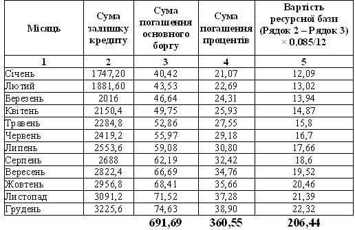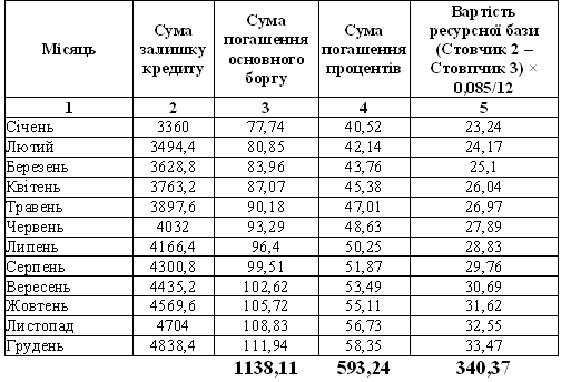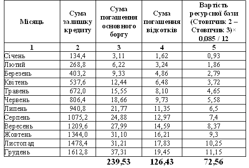 Щомісяця банк „А” надаватиме приблизно 30 кредитів на суму $ 134,4 тис. ($ 5,6 тис ґ 0,80 ґ 30). Розрахунок нарахованих (отриманих) доходів банку „А” за три роки за схемою ануїтетного платежу наведено в таблицях 1, 2, 3 (цифри умовні).