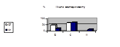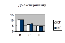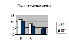 Рис. 4.1 Результати середніх показників рівня фізичного здоров'я (достовірність відмінностей між групами): КГ - контрольна група, ЕГ - експериментальна група; В - високий рівень, С - середній рівень, Н - низький рівень.