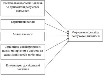 Отже, внесок евристичної бесіди у формування пошукової діяльності в тому, що діти під керівництвом учителя проходять повний цикл пошуку, розгорнутість якого залежить від рівня їхньої підготовленості й точності запитань.