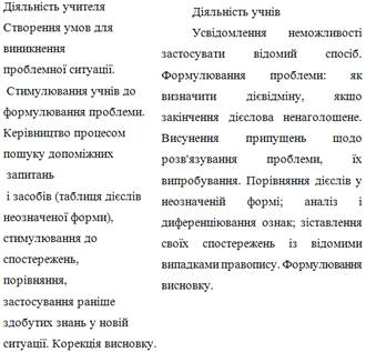 Реалізація розвивальних функцій бесіди починається з постановки проблеми, коли створюють ситуацію необхідності пошуку нового знання. Тут учитель навмисно загострює увагу дітей на об'єкті пошуку. Коли сформульовано проблему, учні під керівництвом учителя відокремлюють відоме від невідомого, актуалізують засвоєні знання. Це робиться з метою усвідомлення: чи можна в цьому разі застосувати відомий шлях (тоді проблему розв'язують сильніші учні з місця на основі перенесення); чи треба шукати нові способи розв'язку проблеми. Подаємо основні етапи роботи вчителя і учнів під час евристичної бесіди.