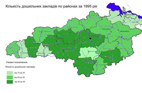 Аналізуючи кількість дошкільних навчальних закладів з 1995 року по 2010 рік, бачимо, що станом на 1995 рік було 9 районів в яких налічувалось від 30 до 49 дитячих садків. Тобто в Бобринецькому - 33, Голованівському - 35, Добровеличківському - 39, Долинському - 32, Кіровоградському - 31, Маловисківському - 36, Новоукраїнському - 35, Олександрівському та Олександрійському районах - 30, був найвищий показник кількості закладів дошкільної освіти.