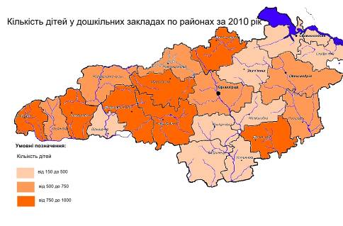 Тенденція зниження кількості дошкільних навчальних закладів з 1995 року пояснюється тим, що природний приріст по області, який складав - 8,4, і кожного району окремо був від’ємним. Найнижчий природний приріст спостерігався у Знам’янському (-15,6), Компаніївському (-13,3), Голованівському (-12,5), Онуфріївському (-17,0) та Новгородківському (-16,6) районах . Тому знижувалась кількість дітей дошкільного віку. Внаслідок цього закривались дитячі садки або їх приміщення передавали в оренду. Особливо стрімке зменшення кількості дошкільних навчальних закладів спостерігалась з 1995 по 2008 роки, тому кількість дошкільних закладів у цих районах зменшилась з 26 до17, з 20 до 17, з 35 до 30, з 16 до 10, з 22 до 15 відповідно. З 1995 року по 2010 рік кількість дітей у дитячих садках зменшилась майже вдвоє з 40,808 тис. до 27,614 тис дітей.