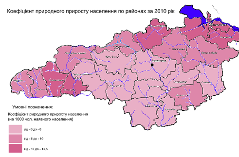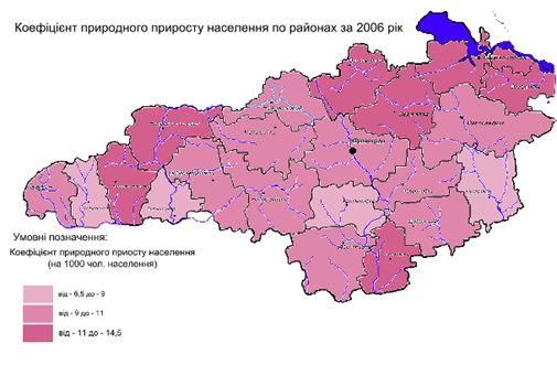 Але на сьогоднішній день проводиться активна політика щодо зменшення кількості померлих дітей до 1 року, а як наслідок підвищення природного приросту населення. Лише у 2010 році показник природного приросту по області став більшим в порівнянні з минулими роками і складав - 7,0. Найменший показник природного приросту спостерігався в таких районах, як Вільшанський (-11,3), Голованівський (-10,1), Олександрівський (-13,3), Онуфріївський (-11,9), Світловодський (-10,1) (рис.3.8) . А у 2006 році він становив аж - 8,8.
