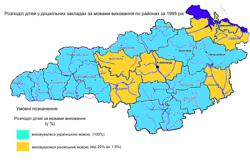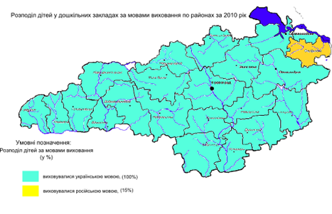 Також позитивні зміни відбулись у кількості дошкільних навчальних закладах в яких діти виховувались російською мовою. Так станом на 1995 рік у області нараховувалось 6 таких районів: Кіровоградський, в якому частка закладів дошкільної освіти з російською мовою виховання складала 9,2%, Маловисківський - 19,6%, Новоукраїнський - 1,2%, Онуфріївський - 6,8%, Петрівський - 8,3% і Світловодський - 7,6% (рис. 3.10). Це було пов’язано з тим, що до 1991 року Україна входила до складу СРСР. А вже у 2010 році в області тільки в Онуфріївському районі існували дитячі садки з російською мовою виховання, частка яких складала 4,8% (рис. 3.11). На даний час 217 дітей дошкільного віку виховуються у російськомовних закладах дошкільної освіти. Тобто це говорить про те, що в області прослідковується тенденція до зменшення кількості національних меншин, зокрема росіян, виїзд їх на батьківщину, та підвищення ролі української мови, в тому числі і в галузі дошкільної освіти.