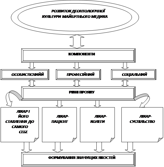 У процесі дослідження розроблено та обґрунтовано модель розвитку деонтологічної культури, яка містить такі компоненти: особистісний, професійний та соціальний, що реалізуються через такі рівні прояву: “лікар і його ставлення до самого себе”, “лікар – пацієнт”, “лікар – колеги” та “лікар – суспільство” (Рис.1).