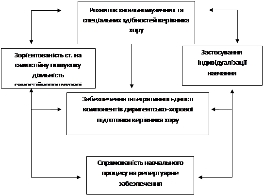 Визначені у процесі дослідження психолого-педагогічні умови спонукали до пошуку шляхів оптимізації цілісно-комплексної структури підготовки студентів як керівника хору, ймовірно обумовили протікання процесу підготовки, забезпечили можливість активної організації навчальної діяльності студентів (див. схема 1.1.).