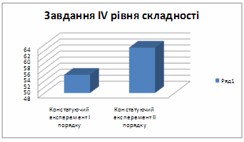 Проаналізувавши дану стовпчикову діаграму можна зробити наступний висновок. Що з завданням найвищого рівня складності справились у констатуючому експерименті І порядку лише кілька учнів класу. Про цю цифру ми не можемо говорити, як і в попередніх випадках, адже в полі нашого дослідження е порівняння результатів, котрі ми отримали під час констатуючого експерименту ІІ порядку у порівнянні з результатами попередньої успішності класу. А от під час констатуючого експерименту ІІ порядку, з цим завданням вже справилось майже половина учнів. Наведені факти наочно свідчать про ефективність застосування у навчальному процесі методики з використанням різноманітних навчальних моделей, які всебічно сприяють формуванню в учнів географічних компетенцій. Адже учні вже без затруднень виконують завдання ІV рівня складності, які до цього не були їм під силу, а це ще раз говорить нам про те, що доцільно використовувати в навчальному процесі різноманітні навчальні моделі. Результати ІV рівня складності ще раз переконують у доцільності та ефективності даної методики навчання.