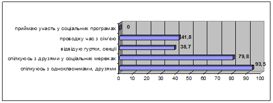 Майже всі учні у свій вільний час спілкуються з однокласниками та друзями – 93,5 %. Значна кількість учнів (79,8 %) віддають перевагу спілкуванню у соувальних иережах (Вконтнакте, Одноклассники, Facebook та ін.). 41,8 % - проводить свій вільний час з сім’єю та 38,7 % відвідують гуртки та секції. Слід звернути увагу, що жоден учень з класу не приймає участі у соціальних програмах.