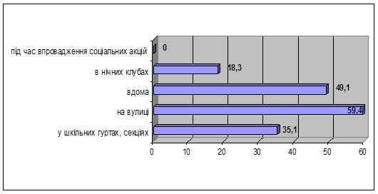 Більша половина учнів спілкується з однолітками після уроків на вулиці – 59,4 %, значна частина опитаних спілкується вдома (49,1 %) та у шкільних гуртках і секціях (35,1 %).