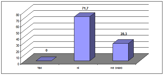 Більшість учнів – 71,7 % відповіли, що у їх школі не впроваджуються школі соціальні програми щодо профілактики вживання наркотичних речовин та 28,3 % не знають відповіді на це запитання.