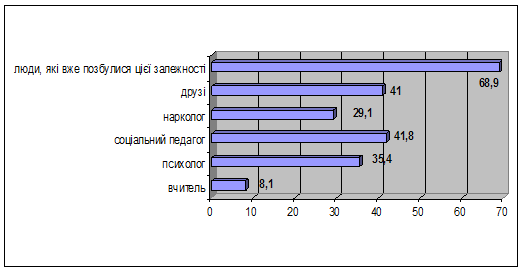 68,9 % учнів вважають, що спілкуватися з підлітками щодо припинення вживання наркотичних речовин має людина, що позбавилася цієї залежності. Однакові кількість учнів (41%) вважають, що це повинні бути друзі та социальний педагог, 35,4 % обрали психолога та 29,1 % - нарколога.