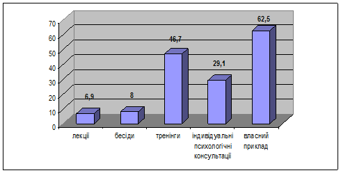 Більша половина учнів серед усіх форм впливу на наркозалежних людей 62,5 % обрали власний приклад, 46,7 % - тренінги та 29,1 – індивідуальні психологічні консультації. Незначна кількість учнів віддали перевагу лекціям – 6,9 % та бесідам – 8 %.