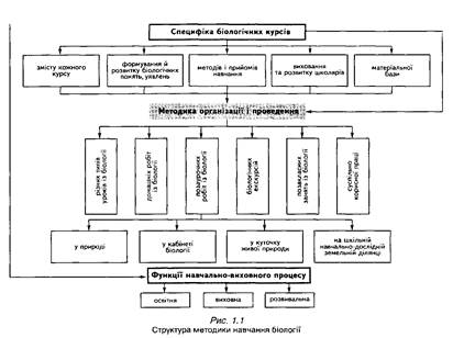 Структура методики навчання біології (рис. 1.1) науково обґрунтована. Виокремлюють загальну методику навчання біології та спеціальні (окремі) методики вивчення біології (розділів «Природознавство», «Рослини», «Тварини», «Біологія людини», «Загальна біологія»).