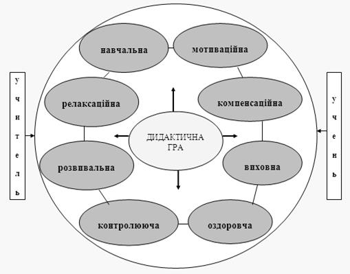 Відповідно до схеми, дидактична гра у навчальному процесі виконує такі функції: навчальну, виховну, розвивальну, мотиваційну, контролюючу, компенсаційну, релаксаційну й оздоровчу.