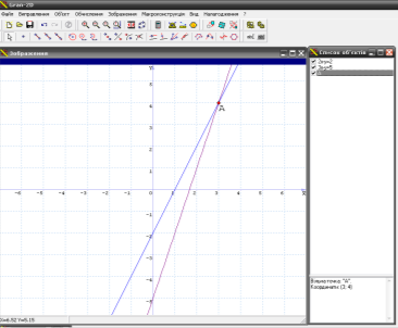 За допомогою вкладки «Список об’єктів» визначаємо координати утвореної точки, тобто розв’язок заданої системи рівнянь (мал. 13).