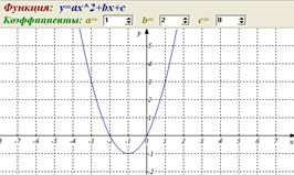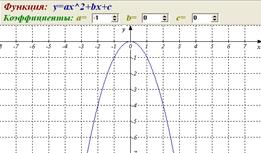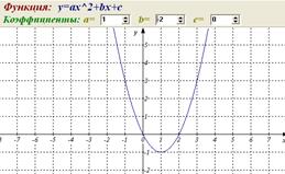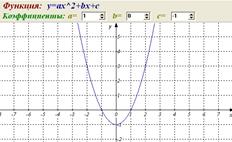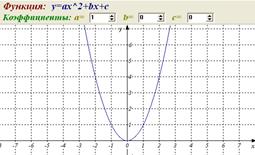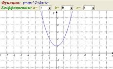 Розглянемо, наприклад, як змінюється графік функції y=ax2 + bx + c при зміні коефіцієнтів a, b і с. Для цього в меню просто вибираємо потрібну функцію. Зміни розташування графіка в залежності від зміни коефіцієнтів простежуються дуже добре (мал. 15 – мал. 20). Управління програмою надзвичайно просте і не вимагає суттєвих витрат часу для того, щоб навчити учнів працювати з нею.