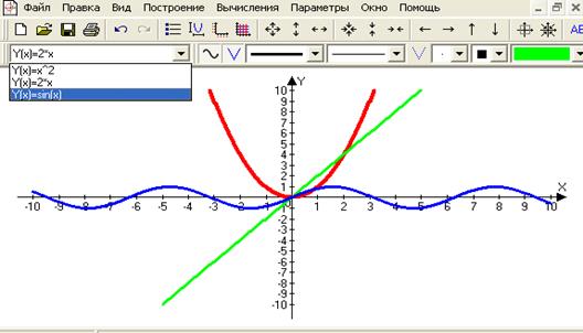 Розглянемо, наприклад, процес побудови графіків функцій y=x2, y=sin x та y=2x в одній системі координат. Для цього досить виконати набір нескладних дій (мал. 21 – 23).