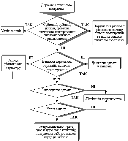 Якщо мобілізованих фінансових ресурсів із децентралізованих джерел не вистачило для успішного проведення санації чи реструктуризації, то в певних випадках може бути прийняте рішення про надання державної фінансової підтримки. Згідно із Законом України «Про підприємства» у разі збиткової діяльності підприємств держава, якщо вона визнає продукцію цих підприємств суспільно необхідною, може надавати їм дотації чи інші пільги.