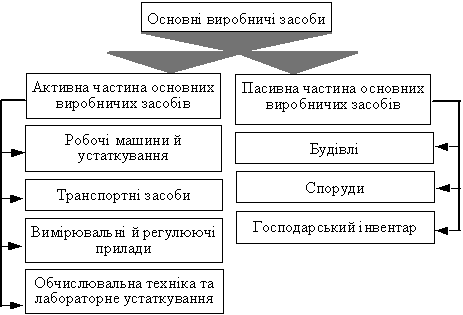 основних засобів, які обслуговують процес виробництва і характеризують виробничі можливості підприємства. Ясна річ, що для забезпечення нормального функціонування активних елементів основних виробничих засобів необхідні будівлі, споруди, інвентар, тобто пасивна частина основних засобів.