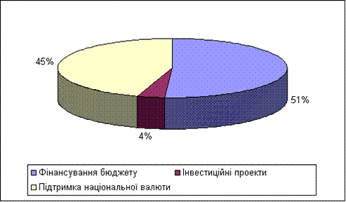 Невиправданою є також порівняно висока (45%) частка використання запозичених коштів для підтримки національної валюти (3,5 млрд.дол.). Це надто висока ціна для національної економіки, яка засвідчує недостатню ефективність грошово-кредитної політики Національного банку України за попередні роки.