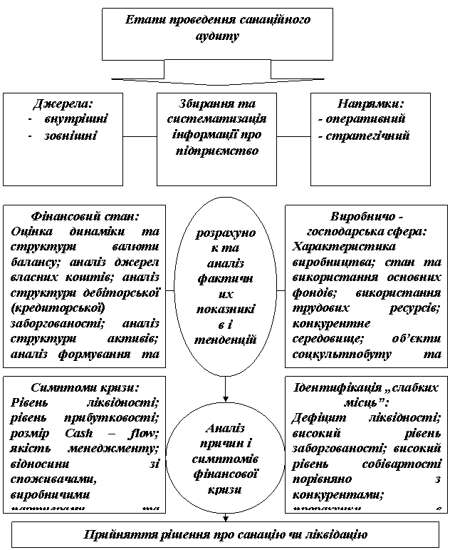 - аналіз стану підприємства і причин, що його зумовили, оцінка можливості санації, а також її вид;