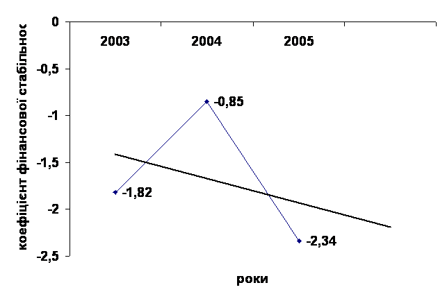 Коефіцієнт фінансової стабільності весь аналізований період має від’ємне значення, що вказує на перевищення позикових коштів над власними коштами підприємства. Нормативне значення коефіцієнта має бути більшим ніж 1 [20.180]. На даному підприємстві спостерігається відсутність власного капіталу через постійні збитки. Тенденції до збільшення значення коефіцієнта не спостерігається, навпаки у 2005 році відбувся різкий спад показника фінансової стабільності, так як збільшилася сума залучених коштів на підприємстві.
