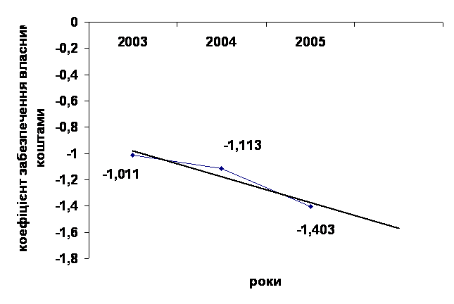 Наявність збитків на протязі 2003 – 2005 років не дає можливості підприємству збільшити власні кошти, у результаті чого спостерігається тенденція до подальшого зниження коефіцієнта забезпечення власними коштами. На кінець 2005 року значення коефіцієнта становило (- 1,403).