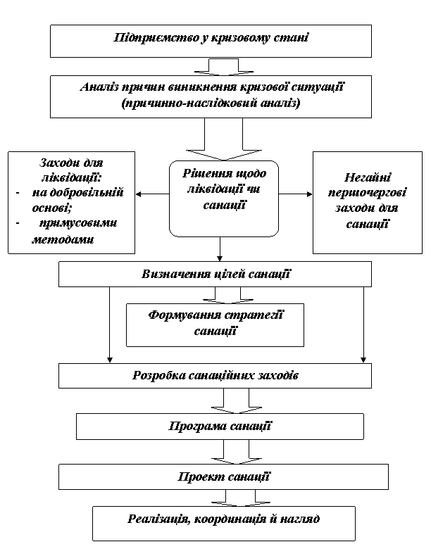 7. З ініціативи Національного банку України, якщо мова йде про фінансове оздоровлення комерційного банку. Режим санації є превентивним заходом впливу НБУ на комерційний банк перед застосуванням санкцій, передбачених законодавством.[2.с.3] Цілісний погляд на етапи проведення фінансового оздоровлення окремого підприємства становить так звана класична модель санації, що широко використовується як основа для розробки механізму фінансової санації господарюючих суб`єктів у країнах з розвинутою ринковою економікою (рисунок 1.2.2) [20.с.28]