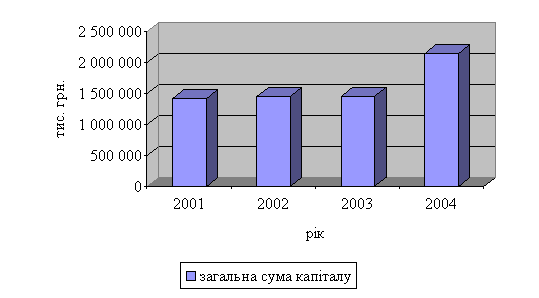 Аналіз динаміки фінансових ресурсів підприємства (таблиця 2.9) показав, що в цілому за досліджуваний період відбулось значне зростання загальної суми капіталу (валюти балансу) з 1416620 тис. грн. у 2001р. до 2143622 тис.грн. у 2004р. – 51,32% . Динаміка загальної суми капіталу ВАТ „Північний ГЗК” представлена на рис. 2.3