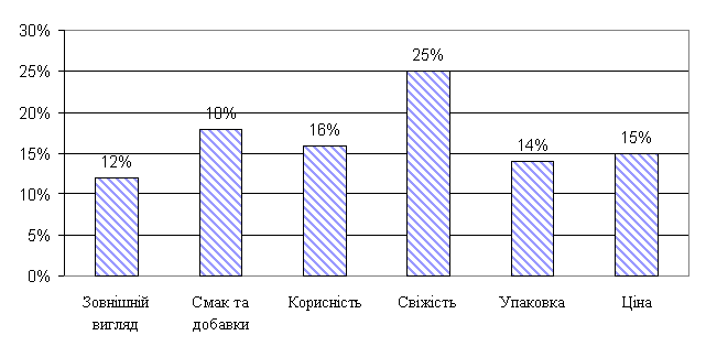 Хлібобулочна продукція ТОВ "Iнгулецький хлiбзавод" на даний момент є не досить конкурентоспроможною. Причиною цього є низька якість та висока собівартість виготовляємої продукції. Низька якість продукції пов’язана з застарілою технічною базою виробництва та недосконалою технологією випікання хлібобулочних виробів. Висока собівартість продукції пояснюється складеною на даний час високою ціною муки та великими енерговитратами на виробництво продукції. Тому ціна на продукцію ТОВ "Iнгулецький хлiбзавод" знаходиться на рівні цін на продукцію міні-пекарень, якість хлібобулочних виробів яких значно краще. При купівлі хлібобулочних виробів покупці звертають увагу на такі головні складові як (рис. 2.4):