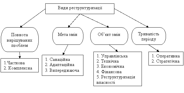 Характер та особливості ресртуктуризаційних процесів значною мірою залежать від виду реструктуризації (рис. 1.1) [4, с.402] .