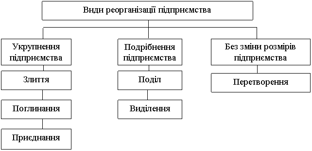 [14, с.294]: 1. Реорганізація, спрямована на укрупнення підприємства (злиття, приєднання, поглинання). 2. Реорганізація, спрямована на подрібнення підприємства ( поділ, виокремлення). 3. Реорганізація без зміни розмірів підприємства (перетворення).